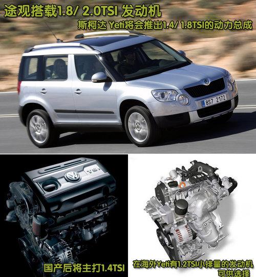 上海大众Tiguan途观搭载的是1.8/2.0TSI两款发动机,而很明显Tiguan途观主打1.8TSI排量的车型。而即将国产的斯柯达Yeti也将推出两款排量的发动机分别是1.4/1.8TSI,国产后因为与Tiguan途观定位不同,走的是“低价”路线,所以国产后后的斯柯达Yeti将主推1.4TSI。在海外市场,斯柯达Yeti搭载了1.2/1.8TSI两款汽油涡轮增压直喷发动机和一款具有三种调教的2.0TDI柴油发动机。而1.2TSI发动机已经确定要国产,并有望出现在斯柯达Yeti的身上。