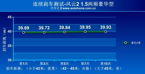 我们对风云21.5L两厢豪华型进行的性能测试中显示,从100KM/h全力制动到车辆静止,刹车距离为39.8米,成绩非常出色;刹车踏板回馈力较大,所以在刹车时需要使用更大力气,在日常驾驶中踏板的余量偏大,不过一旦深踩,制动效果明显。