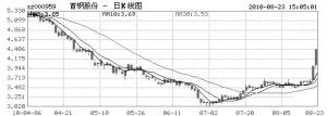受此利好消息影响,尽管大盘震荡,但首钢股份已连续四日收阳。昨日,首钢股份涨停,收盘于每股4.39元。