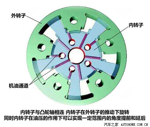 简单的说,VVT系统就是通过在凸轮轴的传动端加装一套液力机构,从而实现凸轮轴在一定范围内的角度调节,也就相当于对气门的开启和关闭时刻进行了调整。