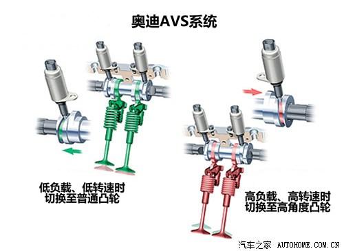 奥迪AVS可变气门升程系统在发动机700至4000转之间工作,当发动机处于中间转速区域进行定速巡航时,AVS系统可以为车辆提供很好的节油效果。不过这套系统的气门升程依然是两段式的,没有做到气门升程的无级调节,所以对进气流量的控制还不够精确。
