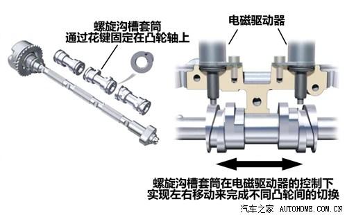 奥迪的AVS可变气门升程系统在设计理念上与本田的i-vtec有着异曲同工之妙,只是在实施手段上略有不同。这套系统为每个进气门设计了两组不同角度的凸轮,同时在凸轮轴上安装有螺旋沟槽套筒。螺旋沟槽套筒由电磁驱动器加以控制,用以切换两组不同的凸轮,从而改变进气门的升程。