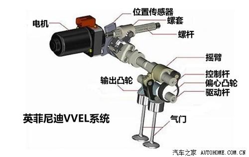 英菲尼迪的VVEL系统的工作原理与BMW的Valvetronic类似,但在结构上稍有不同。VVEL系统使用一套螺套和螺杆的组合实现了气门升程的连续可调。在系统工作时,电机通过ECU信号控制螺杆和螺套的相对位置,螺套则带动摇臂、控制杆等部件,最终改变气门升程的大小。