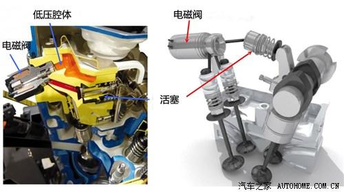 Multiair系统的工作原理要直接得多,而且结构相对简单。进气门由一个活塞、液压腔和电磁阀气门上方设计有一个液压腔,液压腔一端与电磁阀相连,电磁阀则通过ECU信号,根据工况的不同适时调节流向液压腔内的油量。由凸轮轴驱动的活塞通过推动液压腔内的油液,控制气门的开启。系统只需要控制液压腔内的油量的多少即可以完成对气门升程的无级可调。