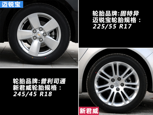 在轮胎的应用方面,迈锐宝的尺寸数据要稍小一些,225/55 R17的轮胎数据和新君威245/45 R18相比,从轮毂的直径和胎面的宽度上都整整小了一圈,而使用的轮胎品牌上,迈锐宝使用了固特异,新君威则是普利司通。当然我们不能仅仅从轮胎厂家来判断谁的成本更高,毕竟不同的型号和系列也决定了他们之间的差价。但从轮胎基本上的数据来看,新君威在这一项上无疑更加厚道。