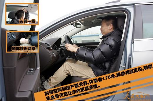 迈腾旅行版的前排空间和国产的基本没有区别,属于相当充裕的级别。我们的体验编辑身高1.78米,不计算天窗空间的情况下头部空间一拳有余,腿部空间接近两拳。
