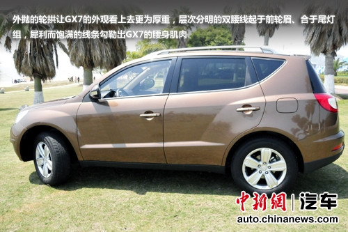 外抛的轮拱让GX7的外观看上去更为厚重,层次分明的双腰线起于前轮眉、合于尾灯组,犀利而饱满的线条勾勒出GX7的腰身肌肉,加强侧身的立体感。加上车身腰线与上扬的侧窗使得外形动感、时尚。