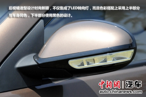 后视镜造型设计时尚新颖,不仅集成了LED转向灯,而且色彩搭配上采用上半部分与车身同色,下半部分使用黑色的设计。带有镀铬装饰条的门把手起到了点缀车身的作用,提升了整车的质感。后排车窗采用了更具隐私性的深色玻璃。
