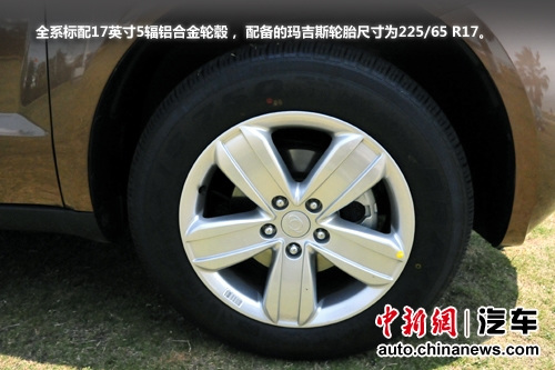 全系标配17英寸5辐铝合金轮毂, 配备的玛吉斯轮胎尺寸为225/65 R17。