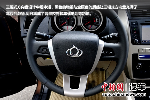 三辐式方向盘设计中规中矩,黑色的稳重与金属色的质感让三辐式方向盘充满了驾驭的激情,同时集成了音量控制和车载电话等功能。