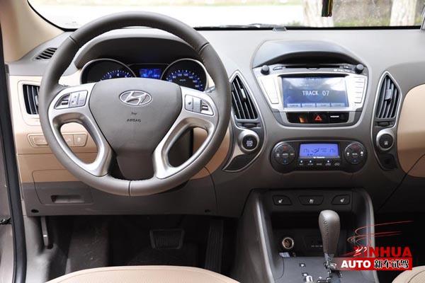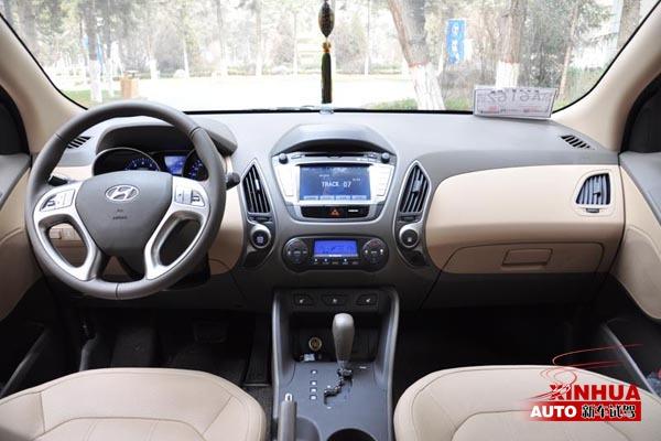 2012款ix35的整体内饰风格继承了现代全新一代家族特征,无论方向盘还是中控台都突出了“X”元素,配色采用上深下浅的颜色搭配,具有很强的整体层次感。做工依然保持了现代汽车一贯的高水准。
