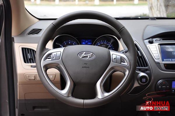 ix35采用四幅多功能方向盘,尺寸适中,粗细合适,真皮搭配大面积银色装饰,既显高档又充满了运动气息。方向盘左右两侧分别集成了音响和定速巡航功能。