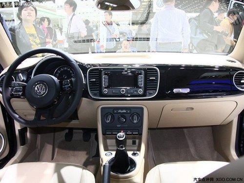 内饰方面,新一代甲壳虫内饰经过全新设计,中控台采用碳纤维亚光面板,仪表盘造型圆巧可爱,位于中央的车速表上带有多功能显示。中部的收音-导航信息娱乐系统以及下方空调控制系统布局合理,方便操作。在副驾驶席的位置额外配备一个嵌入面板、向上开启的贮物箱。此外还配备了全新设计的多功能方向盘。