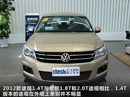 2012款途观1.4T与老款1.8T和2.0T途观相比,1.4T版本的途观在外观上差别并不明显。前脸唯一的差别在于1.4T新车型的两条进气格栅,采用的是和1.8T低配版本同样的单条式,而老款款其它版本都是双条式。除此之外,大灯与保险杠也有变化。