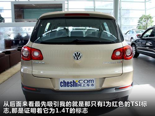 从后面来看最先吸引我的就是那只有I为红色的TSI标志。那是证明着它为1.4T的标志。TSI三个字母的颜色差别,就代表了大众发动机的不同定位。全红色字母代表的是2.0T、“SI”两个红色字母,代表的是1.8T,而一个字母“I”是红色,则代表车上搭载的是1.4T发动