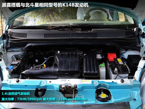 派喜采用了与北斗星相同型号的K14B型号发动机,发动机最大功率73kW/5900rpm,最大扭矩:134Nm/4800rpm。对于这样一款小车来说,配置1.0L的发动机足以满足日常使用,这样的动力配置给我一种大马拉小车的感觉。