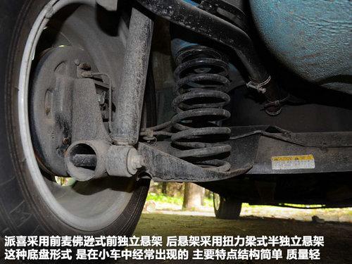 派喜前悬挂采用我们非常熟悉的麦佛逊式前悬架,调校较硬的悬架在快速过弯时反应还是非常快的。后面则采用的是扭力梁式后悬架。 较硬的调教在通过不平坦的路面时后排乘客会很不舒服,但这样的调教的底盘我们在高速120公里每小时的情况下也不会感到发飘。