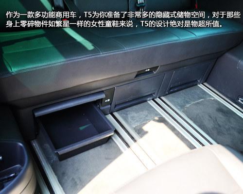 T5的脚底下预设了很多的储物空间,甚至还给你预留了一个用来储物的塑料篮子,细心之余也大大提升了车内的空间可利用性,我想对于零碎物件比较多的女性们,这些设计无疑大快人心。