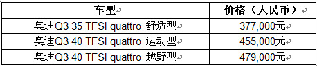 在这场以“点燃目光之城”为主题的“奥迪Q3上市暨奥迪足球之夜”活动中,一汽-大众奥迪销售事业部宣布,此次上市的进口奥迪Q3的价格是:奥迪Q3 35 TFSI quattro 舒适型37.70万元,奥迪Q3 40 TFSI quattro 运动型45.50万元,奥迪Q3 40 TFSI quattro 越野型47.90万元。