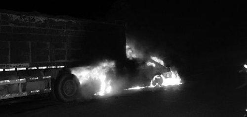 一辆大众朗逸轿车因爆胎失控,一头插进一辆大货车尾部,车身瞬间起火,等救援人员将大火扑灭时,发现朗逸的驾驶座与副驾驶座上还有两个人,但已经没有了生命体征。