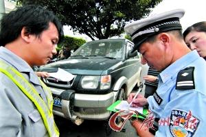 交警在对违章停放的车辆开具罚单。记者张宇杰 摄