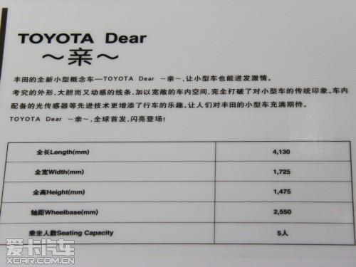 参与互动(0)最新消息,爱卡汽车成都车展前方报道团队在展前探馆过程中,拍摄到了丰田今年刚刚发布的车型“TOYOTA Dear~亲~”,这款车型是为中国用户而设计研发的小型概念车,计划在2013年投放中国市场。