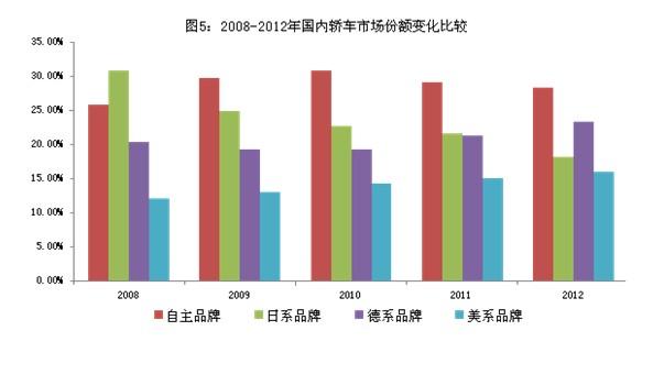 2012年,自主品牌乘用车销售648.50万辆,同比增长6.1%,占乘用车销售市场的41.9%,市场份额同比下降0.3个百分点。其中,自主品牌轿车销售304.96万辆,同比增长3.5%,占轿车市场的28.4 %,市场份额同比下降0.7个百分点,较排名第二的德系车高出5个百分点。(见附图5)