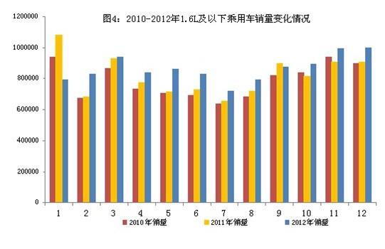 2012年,在节能汽车推广政策及节约能源、新能源车辆车船税优惠政策的作用下,小排量乘用车市场占有率逐步回升。2012年,1.6升及以下排量乘用车全年共销售1040.50万辆,同比增长5.7%;占乘用车销售市场的67.2%,较2011年下降0.8个百分点;占汽车销售市场的53.9%,较2011年增长0.7个百分点。(见附图4)