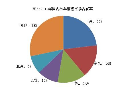 2012年,5家汽车生产企业(集团)产销规模超过100万,其中上汽销量突破400万辆,达到446.14万辆,东风、一汽、长安和北汽分别达到307.85万辆、264.59万辆、195.64万辆和169.11万辆。上述5家企业(集团)2012年共销售汽车1383.33万辆,占汽车销售总量的71.7%,汽车产业集中度同比提高0.5个百分点。(见附图6)