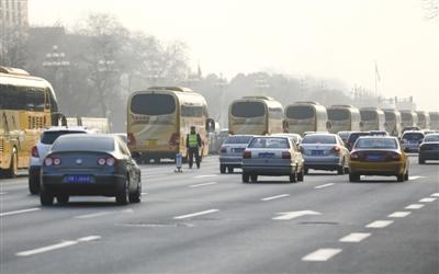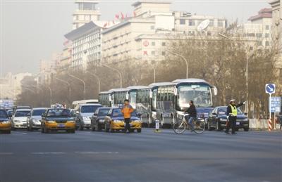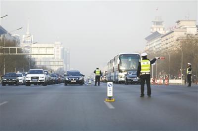 8时左右,第一个车队即将到达和平门路口,交警临时腾出两条车道,供与会车队通行,由于路面车流量尚未达到饱和,社会车辆通行比较顺畅。