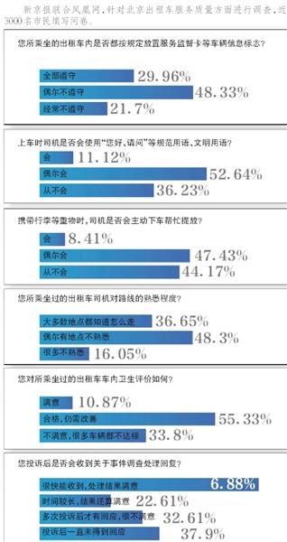 近日,新京报联合凤凰网,针对北京出租车服务质量方面进行了一项调查。结果显示,近3000名填写问卷的乘客中,多数受访者对北京出租车服务质量存在不满。