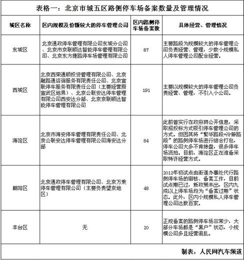 记者在采访中了解到,目前,北京市各区的路侧停车场管理水平存在较大差异。西城区、东城区的路侧停车场由几家大公司负责经营和管理,相对比较正规;海淀区在繁华地区的路侧停车场较为正规,以安达、顺达及其它一些小规模停车管理公司共同经营、管理,目前,海淀区已停止路侧停车场管理的公开招标工作,打算试点以特许经营方式进行停车管理;而丰台区、朝阳区这种地域范围较大的区域,其备案的正规路侧停车场数量反而较少,除个别大公司的停车场进行了备案以外,数百家小公司划地为界的路侧停车场均属违规收费。