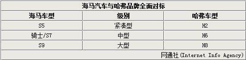 海马SUV产品中目前只有骑士,以及骑士全新换代车型S7两款款中型车,单一的产品线导致海马在国内SUV市场中的竞争力并不强。为了进一步丰富SUV产品序列,海马还将在明年推出一款名为S5的紧凑型SUV。到2015年,海马将拥有骑士SUV、S5紧凑型SUV、S7中型SUV以及S9大型SUV四款款车型,产品线的全面覆盖也直接与哈弗的H2、H6、H8车型进行相应级别的对标竞争。