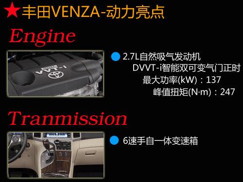 VENZA目前搭载的是一款2.7L双VVT-i发动机,该发动机凭借双智能可变气门正时技术,可在低转速情况下发挥出强大的扭矩,不仅起步反应迅速而且更加节油。该发动机最大功率137kw,最大扭矩247N·m,搭配六速手自一体变速器,动力性能出色。