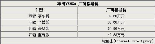 今日,广汽丰田全新进口SUV车型VENZA(威飒)正式上市,新车先期上市为搭载一台2.7L自然吸气发动机车型,分两驱版和四驱版共四款车型同时上市,售价区间为32.66-40.88万元,而后续或将还有一款3.5L排量车型有望引进。