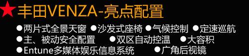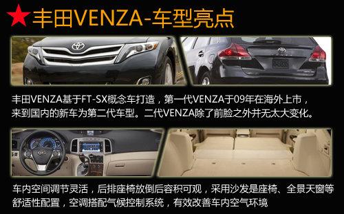 VENZA首次进入国内,凭借其大气沉稳又不失锋芒的外观设计,将吸引更多消费者的注意。宽敞舒适的车内空间和不俗的动力性能,也将在与同级对手本田歌诗图、日产楼兰车型的竞争中加分不少。同时作为一款中高端休闲旅行车,售价也更为亲民。