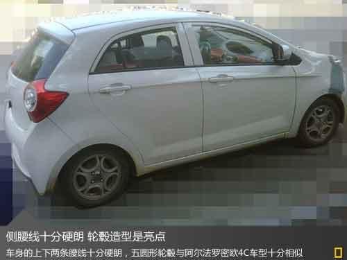 车侧的腰线十分硬朗,上腰线由前翼子板一直延伸到尾灯处,并且贯穿前后门拉把,抵消拉把存在的突兀感;轮毂设计则参考了阿尔法罗密欧4C车型的五圆形设计,更富运动特性。