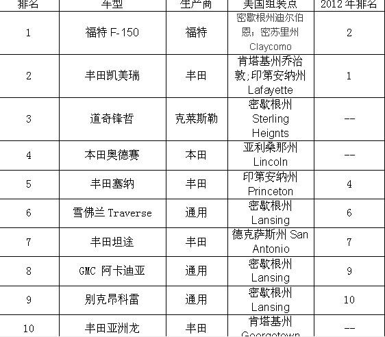 前十中的美国国产和非国产品牌平分秋色。丰田上榜车型最多,有四个;通用有三款,福特、本田、克莱斯勒各有一款车型上榜。