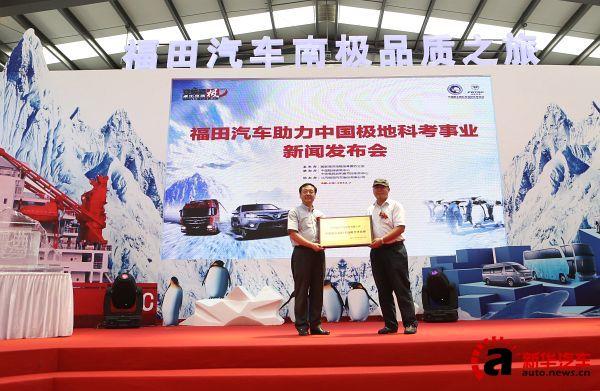 中国极地研究中心党委书记袁绍宏(右)向福田汽车集团党委副书记赵景光(左)授予福田汽车“中国南北极科考战略合作伙伴”牌匾。