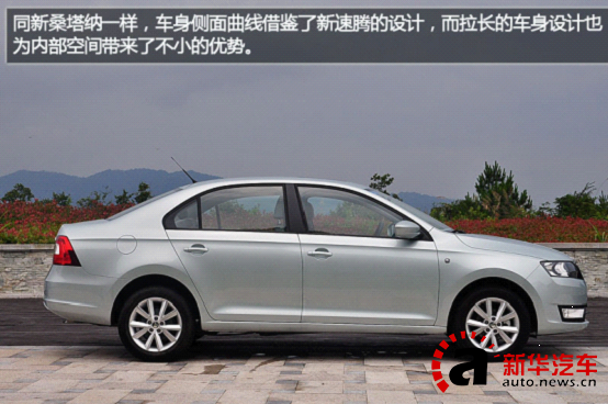 同新桑塔纳一样,车身侧面曲线借鉴了新速腾的设计,而拉长的车身设计也为内部空间带来了不小的优势。C柱上方的天线明显就是POLO的家族特色。Rapid昕锐车身长4501mm、宽1706mm、高1469mm,轴距为2603mm。