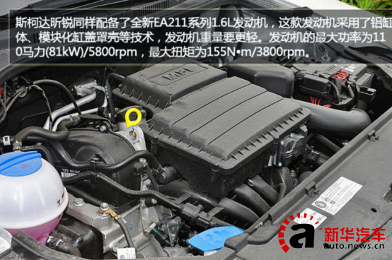 斯柯达昕锐同样配备了全新EA211系列1.6L发动机,这款发动机采用了铝缸体、模块化缸盖罩壳等技术,发动机重量要更轻。发动机的最大功率为110马力(81kW)/5800rpm,最大扭矩为155N·m/3800rpm。在实际驾驶中,动力输出相当温柔,狠踩油门,发动机只会怒吼,但车速提升并不迅猛——即使挡位挂到S挡。