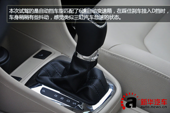 本次试驾的是自动挡车型匹配了6速自动变速箱,在踩住刹车挂入D挡时,车身稍稍有些抖动,感觉类似三缸汽车怠速的状态。开车上路,变速箱与发动机的匹配相当完美,可以说完全感觉不到换挡动作,没有手动模式的设定完全是识相的,因为就连S挡对动力的改善也无能为力。