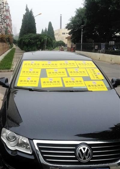 昨日下午,草桥欣园三区,一辆停在路旁的帕萨特前车窗贴了12张警示黄纸,占满了整块挡风玻璃。 新京报记者 林野 摄