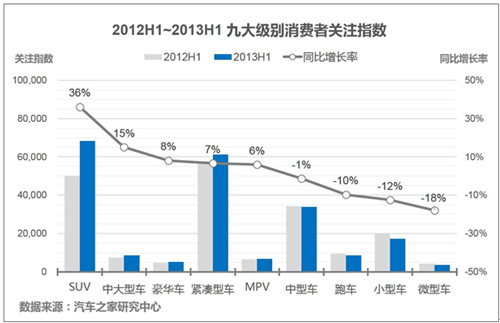 2013年上半年,消费者对于中型车、跑车、小型车和微型车的关注有着不同程度的下降,目前中型车市场正经历着来自SUV以及中大型车的冲击,SUV的火爆自然不用多说,中大型车和豪华车的价格不断下探使得中型车市场前景不甚乐观。