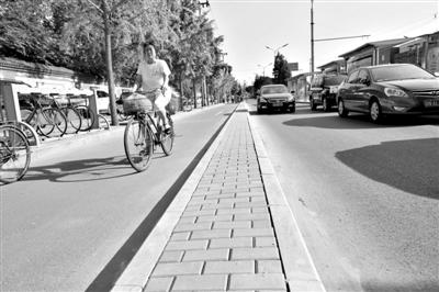 昨日,崇文门外大街,为了区别自行车道和机动车道,保证市民的骑行环境,两类车道之间铺设了“隔离带”。新京报记者 王贵彬 摄