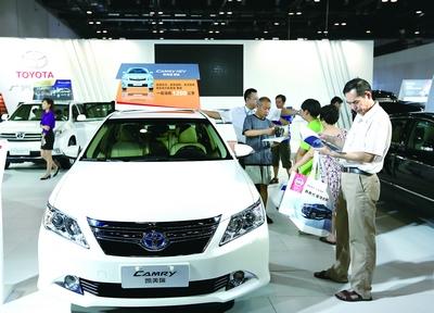 图为在近日举办的北京汽车展览会上,观众在一款油电混合动力节油汽车展台前驻足观看。