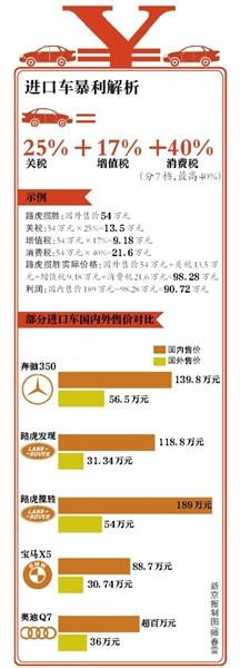 然而事实并非如此,上海汽车进出口有限公司整车进口事业部总监高济华介绍,我国进口汽车关税为25%,增值税为17%,消费税分7档,最高为40%,即使以排量4.0升以上、税额最高的情况测算,一辆进口车应缴税额为车价的1.4375倍,国内销售很多进口车价格是国外同款产品的3倍,显然存在暴利。