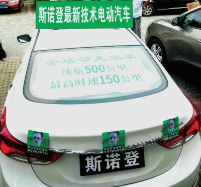 朱和丰:“斯诺登电动车”曾穿长安街跑五环进行绿色环保理念宣传,经过长安街时,被警方叫停,责令清除所有斯诺登装饰物。我们比较无奈,没有一个公证部门可以对我们的电动汽车“一次充电跑500公里以上”的优点进行法律公证。(记者黄菲菲)
