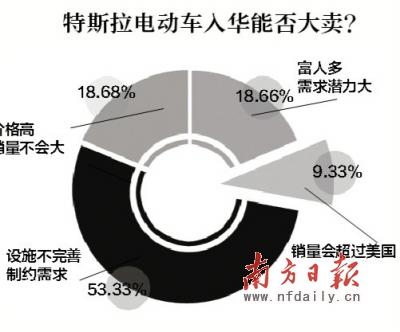 有投票者表示,国内现行的制度法规和现有的配套设施都不完善,因此对特斯拉入华前景不看好。但也有投票者表示,如果按照特斯拉在美国的价格,在中国也将能热卖,不过进口车因为关税等问题将会大幅提高价格。也有人表示:“只有那些真正知识性富豪才会买这个车,给人一个环保低碳了形象。一般有钱人还是钟情大排量车,而不会去选择这种车。”