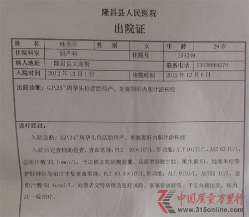 问题出在2012年10月,陈先生告诉记者,在妻子怀孕20周左右,胎儿突然出现缺氧情况,不得不在隆昌县人民医院多次进行吸氧治疗。至于胎儿为何缺氧,院方表示原因不明。2012年11月底,在孕期32周,陈先生的妻子被确诊患妊娠期肝内胆汁淤积症。在隆昌县人民医院治疗一周后,由于情况严重转院至内江市第一人民医院。又一周后,陈先生的妻子被迫剖腹早产下一男婴。